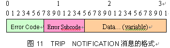 除去TRIP固定的消息頭外,NOTIFICATION消息的格式如圖11,其最小的長(zhǎng)度為5個(gè)字節(jié)。