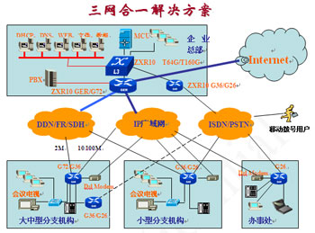 中興通訊具有豐富的數(shù)據(jù)、視訊、語音網(wǎng)關(guān)等設(shè)備,能提供端到端的語音、數(shù)據(jù)、視訊三網(wǎng)合一解決方案。企業(yè)內(nèi)部電話/視訊長(zhǎng)途走自己的數(shù)據(jù)網(wǎng),節(jié)約費(fèi)用;組成語音VPN/視訊 VPN,多種手段保證Qos。