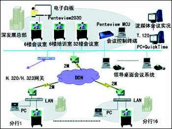 中太數(shù)據(jù)為深圳發(fā)展銀行構(gòu)建的視頻會議項目,是為深圳發(fā)展銀行在已有的DDN網(wǎng)絡(luò)的基礎(chǔ)上,構(gòu)建的一個全國性的會議電視平臺。通過這個平臺,使跨地域的溝通更加經(jīng)濟、高效和靈活。針對深發(fā)展的網(wǎng)絡(luò)實際情況以及會議電視的發(fā)展方向,方案中采用基于MPEG-4的Penteview2030產(chǎn)品,支持H.323的MCU Penteview 6182,以及Penteview數(shù)據(jù)會議服務(wù)器。整個深發(fā)展會議電視系統(tǒng)組網(wǎng)分為兩級,中心點3套Penteview 2030到下面的16個異地的分支行。深圳發(fā)展銀行大廈6樓大會議室、培訓小會議室、32樓會議室作為主會議室,在6樓的機房中放置主MCU和一個終端,培訓小會議室放置一個終端,其他16個異地分支行分別放置一臺Penteview2030終端,通過現(xiàn)有的深發(fā)展DDN網(wǎng)絡(luò)相互連通。根據(jù)深發(fā)展通信網(wǎng)絡(luò)結(jié)構(gòu)及傳輸容量的實際情況,該系統(tǒng)采用星型拓撲連接,各地可通過現(xiàn)有的DDN劃出768k-2M的帶寬,以視頻會議的方式組建起多點會議電視系統(tǒng)。各會場通過PC機實現(xiàn)數(shù)據(jù)會議功能。