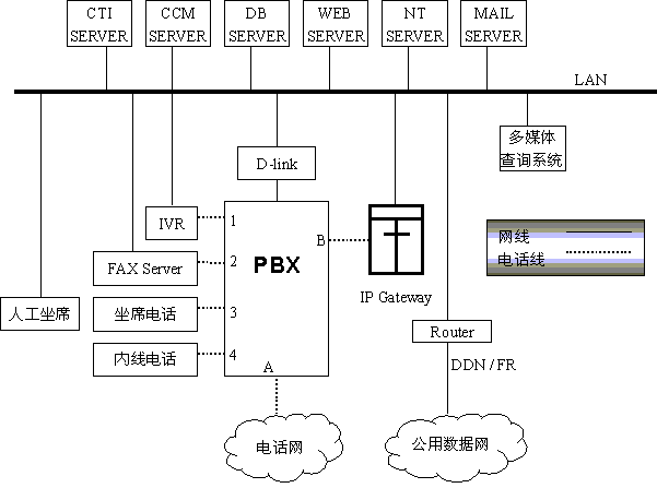 如下圖所示,當(dāng)呼叫從電話網(wǎng)進入客戶服務(wù)中心時,PBX(用戶小交換機)響應(yīng)客戶的呼叫,并將呼叫接至系統(tǒng)的IVR(交互式語音應(yīng)答系統(tǒng)),IVR向客戶送提示音:"您好,這里是×××保險公司,請注意:在任何步驟按0中止當(dāng)前操作退出,按*號轉(zhuǎn)傳真,按#轉(zhuǎn)人工坐席。請繼續(xù)操作:查詢公共信息請按1,查詢客戶檔案請按2,查詢營銷員信息請按3",當(dāng)客戶選擇查詢的信息時IVR進一步提示直到客戶查到滿意的信息為止。提示語音文字的選擇應(yīng)結(jié)合當(dāng)?shù)乜蛻舻睦斫饬?xí)慣仔細斟酌。