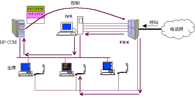 在任何一個步驟中,如客戶選擇了人工坐席,則IVR請求CCM根據(jù)多種情況選擇一個空閑坐席(選擇方法見下文)并控制PBX將呼叫與選擇的人工坐席接通,同時系統(tǒng)在客戶對IVR操作的過程中,已經(jīng)幀測到了客戶所使用的電話號碼、客戶的按鍵信息,系統(tǒng)還記錄有客戶上次的呼叫情況等數(shù)據(jù),這些數(shù)據(jù)基本上可以確定客戶大體關(guān)心的問題,對于老客戶甚至可以初步認定呼叫者的身份、年齡、性別、業(yè)務(wù)辦理情況等,因此,話務(wù)員在與客戶談話之前就已經(jīng)了解了相當(dāng)多的信息,并控制選定的坐席屏幕顯示有關(guān)客戶信息,便于直接進入正題,提高了效率。客戶與坐席的交流過程中,坐席可通過終端請求CCM控制PBX將本次呼叫與其他話務(wù)員(坐席)、專家或業(yè)務(wù)辦公室(如內(nèi)線電話)等接通,當(dāng)坐席人員將呼叫轉(zhuǎn)移到另一坐席或?qū)<視r,系統(tǒng)將在本呼叫中收集的各類數(shù)據(jù)同時轉(zhuǎn)向下一坐席電腦。在坐席人員解答客戶問題時,可將問題及解答情況收集,便于分析坐席人員的業(yè)務(wù)素質(zhì)和問題傾向,從而有針對性地培訓(xùn)坐席人員。對于客戶來講,他可以通過電話按鍵在話務(wù)員、自動語音、傳真、專家和業(yè)務(wù)辦公室之間漫游,系統(tǒng)將記錄客戶漫游的路徑,對于設(shè)計較好的菜單和路經(jīng)來說,客戶的漫游路徑基本上可以反映出其需求,大量客戶的漫游路徑無疑將反映出市場需求。