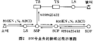 --用戶在撥打800號業(yè)務用戶號碼時,首先由網(wǎng)絡(luò)點上的普通電話交換機接收,并把800KN1N2ABCD號碼經(jīng)話路傳送給業(yè)務交換點SSP,再由SSP將此號碼經(jīng)No.7信令鏈路送到業(yè)務控制點SCP,SCP通過在業(yè)務數(shù)據(jù)庫SDP中查尋譯碼表將此號碼翻譯成普通的電話號碼回送SSP,最后由SSP負責完成電路的連接,該過程如圖2所示。