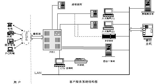 銀行客戶撥入銀行客戶服務(wù)中心系統(tǒng)后,首先聽到歡迎詞“歡迎進(jìn)入客戶服務(wù)中心系統(tǒng),按1對(duì)公查詢,按2儲(chǔ)蓄查詢,按3信用卡查詢,按4金融信息查詢,按5人工服務(wù)”,如果客戶選擇語音、傳真自動(dòng)服務(wù),則進(jìn)入IVR系統(tǒng),客戶可以按照語音提示進(jìn)行選擇,獲得相應(yīng)自動(dòng)服務(wù),如果用戶選擇人工服務(wù),則進(jìn)入人工服務(wù)系統(tǒng),由銀行業(yè)務(wù)人員提供相應(yīng)人工服務(wù)。如果用戶使用金融圖文電話或終端進(jìn)入銀行客戶服務(wù)中心,則系統(tǒng)自動(dòng)轉(zhuǎn)到IVR系統(tǒng)中的MODEM,提供相應(yīng)遠(yuǎn)程查詢服務(wù)。