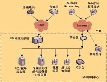 NBX網(wǎng)絡(luò)呼叫中心的核心是3Com公司的NBX網(wǎng)絡(luò)電話交換機(jī),它具有PBX的功能,支持多種外線接入方式,呼入的語(yǔ)音信號(hào)轉(zhuǎn)換為數(shù)據(jù)包,在局域網(wǎng)內(nèi)部傳輸,實(shí)現(xiàn)局域網(wǎng)內(nèi)部語(yǔ)音、數(shù)據(jù)的統(tǒng)一。坐席可以延伸到數(shù)據(jù)網(wǎng)可以達(dá)到的地方(適當(dāng)?shù)膸挘皇艿乩砦恢玫南拗。你可以通過申請(qǐng)各類專線,如VPN、DDN等,將計(jì)算機(jī)連入呼叫中心,實(shí)現(xiàn)分地域、分種類、分?jǐn)?shù)據(jù)的服務(wù)。NBX網(wǎng)絡(luò)呼叫中心擴(kuò)大了對(duì)外服務(wù)方式,通過上網(wǎng)訪問企業(yè)主頁(yè),并使用Windows集成的Netmeeting軟件通過使用電腦的聲卡、耳機(jī)、麥克風(fēng)直接與服務(wù)代理人員進(jìn)行語(yǔ)音交流。
