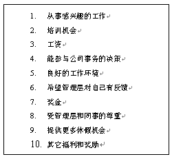 10. 來自公司高層的認(rèn)可。這是一個非常有效的作法,能得到公司高層的認(rèn)可對很多人來說,是一生都可以值得回憶的事情。如果在一家全球的大公司,和公司CEO共同進餐,得到公司CEO的親筆信,和CEO合影等都是非常高的榮譽。當(dāng)然,這個作法不是可以經(jīng)常用的。因為,如果用得太經(jīng)常了,就可以失去了一種"神秘感"或"來之不易"的感覺。