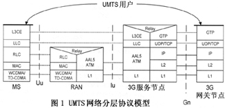 對(duì)圖1的簡(jiǎn)要描述如下:移動(dòng)用戶(MS)到RAN左側(cè)部分是無(wú)線接入網(wǎng)絡(luò)的無(wú)線用戶接口(Uu),實(shí)現(xiàn)了用戶業(yè)務(wù)通過(guò)空中無(wú)線鏈路接入3G網(wǎng)絡(luò)的功能,主要包含物理層(采用WCDMA和TD-CDMA技術(shù))、媒體接入層(MAC)、無(wú)線鏈路層(RLC);在RAN內(nèi)部通過(guò)協(xié)議中繼(Relay)實(shí)現(xiàn)無(wú)線鏈路和有線鏈路的對(duì)接;在RAN和3G服務(wù)節(jié)點(diǎn)之間的接口(Iu)是以ATM技術(shù)為支撐的有線接入段協(xié)議,為支持Internet業(yè)務(wù),采用AAL5適配層協(xié)議,物理層(L1)無(wú)明確限定具體傳輸方式;在此之上,透過(guò)RAN、MS和3G服務(wù)節(jié)點(diǎn)之間存在兩個(gè)高層連接,即邏輯聯(lián)絡(luò)層(LLC)和更為復(fù)雜的第三層實(shí)體(L3CE),L3CE是一些以Client/Server方式構(gòu)件的軟件實(shí)體,實(shí)現(xiàn)諸如無(wú)線資源管理、呼叫控制、移動(dòng)管理等網(wǎng)絡(luò)級(jí)功能;在3G服務(wù)節(jié)點(diǎn)內(nèi)部,為實(shí)現(xiàn)到Internet網(wǎng)絡(luò)的接入,再作一次協(xié)議中繼,這里,第三層實(shí)體的信息映射到通用分組無(wú)線服務(wù)的隧道協(xié)議GTP(GPRS Tunneling Protocol);3G服務(wù)訪問點(diǎn)到3G網(wǎng)關(guān)之間的Gn接口存在清晰的、以TCP/IP協(xié)議為主體的五層對(duì)應(yīng)關(guān)系;構(gòu)建在最上層的是移動(dòng)用戶到3G網(wǎng)關(guān)的UMTS用戶進(jìn)程,它通過(guò)3G網(wǎng)關(guān)進(jìn)入Internet骨干網(wǎng),最終實(shí)現(xiàn)用戶對(duì)Internet的訪問。