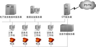 中型呼叫中心:座席代表在50~100之間。據(jù)專業(yè)數(shù)據(jù)統(tǒng)計公司預(yù)測,中型系統(tǒng)需求量最大,因此不少呼叫中心軟、硬件開發(fā)商對準(zhǔn)這一目標(biāo)進(jìn)行開發(fā)。這種系統(tǒng)結(jié)構(gòu)相對簡單,投資也少,容易被中、小企業(yè)所接受。目前我國的一些公司開發(fā)系統(tǒng)多屬于此種類型。它可以省掉大型交換機(jī)的投資,而利用PBX與CTI服務(wù)器和業(yè)務(wù)代表座席直接相連,業(yè)務(wù)代表席同時與應(yīng)用服務(wù)器相連,客戶資料也存在應(yīng)用服務(wù)器中,可實(shí)時地將接入電話的客戶姓名自動在計算機(jī)屏幕上彈出。CTI服務(wù)器一般由CTI硬件開發(fā)商的板卡和PC組成,其擴(kuò)容和增加功能也比較方便,成本也低,因此是一種投資小、見效快、升級也很靈活的系統(tǒng)。