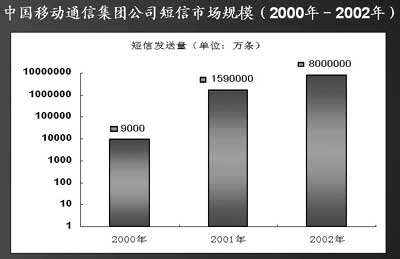 “從2001年的189億條增長到2002年的超過900億條,我國短信業(yè)務(wù)的增長率是移動用戶數(shù)增長率的3.4倍! 計世資訊分析師許牧說。