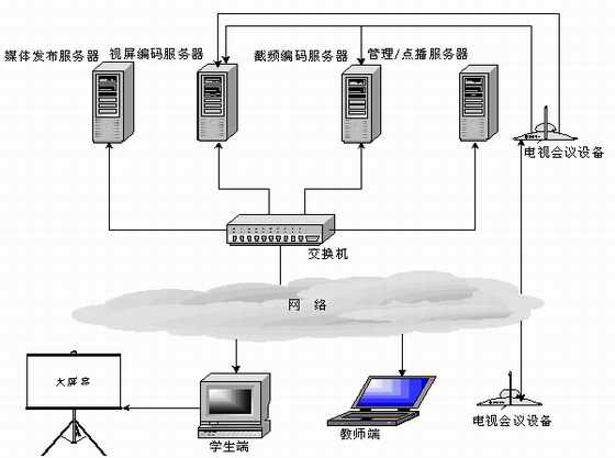 當(dāng)老師端在異地時(攝像頭離服務(wù)器較遠(yuǎn),無法物理連接),可通過“電視會議系統(tǒng)”將老師的圖像及聲音實(shí)時傳送到編碼服務(wù)器,桌面課件可以通過PcAnywhere傳送到編碼服務(wù)器。圖像,聲音和桌面課件通過Web Streaming采集壓縮并在網(wǎng)上實(shí)時廣播。這種系統(tǒng)架構(gòu)也是當(dāng)今功能比較齊全和完善的一種實(shí)現(xiàn)方式。