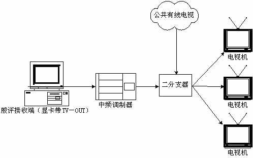 本系統(tǒng)接收端接收實(shí)時廣播時,除了用普通PC機(jī)收看,或把PC機(jī)接收到的信號輸?shù)诫娨暎ù笃粒┥鲜湛矗踔吝可以接入有線電視網(wǎng)進(jìn)行播放。具體方法是通過一個接收端接收股評節(jié)目,通過帶TV-OUT的顯卡把TV信號輸出到中頻調(diào)制設(shè)備,中頻調(diào)制設(shè)備可以把基帶模擬信號轉(zhuǎn)換成一個有線電視信號,且傳輸距離遠(yuǎn),損失小,再把這個信號與有線電視信號一起接入一個二分支器(2進(jìn)1出),這就可以和公共有線電視共存,形成自己的頻道,供電視接收。