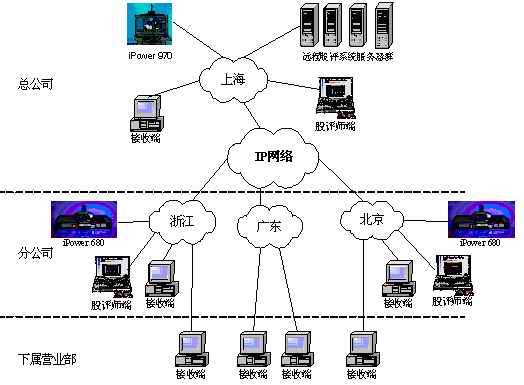 某證券公司有三級網(wǎng)絡(luò),總公司、分公司和下屬營業(yè)部?偣镜椒止編捠2M,在總公司配置一套會議室型電視會議終端POLYCOM 970和一套多點(diǎn)會議服務(wù)器Radvision ViaIP400。在分公司配置了38套會議室型電視會議終端POLYCOM 680,用于與總公司進(jìn)行雙向視頻會議。分公司到營業(yè)部帶寬是512K,各營業(yè)部安裝遠(yuǎn)程股評系統(tǒng)接收端程序,遠(yuǎn)程股評系統(tǒng)服務(wù)器都放置在海通總公司。當(dāng)在總公司進(jìn)行股評時,總公司本地攝像頭拍攝教師畫面,MIC采集教師聲音,傳給服務(wù)器編碼,再通過網(wǎng)絡(luò)供各個接收端接收;當(dāng)在分公司進(jìn)行股評時,首先分公司的電視會議設(shè)備采集教師畫面及聲音傳回總公司的電視會議設(shè)備,再傳給遠(yuǎn)程股評系統(tǒng)的服務(wù)器進(jìn)行編碼,然后通過網(wǎng)絡(luò)發(fā)布,供接收端接收。(結(jié)構(gòu)如下圖)