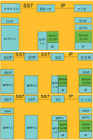 ·信令網關(SG)終結MTP2協議,將MTP2、MTP3之間的原語封裝為M2UA消息,在信令網關功能和軟交換設備間傳遞,信令網關與軟交換分別實現MTP1/2和3層功能;