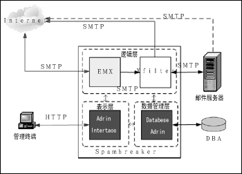 在這里,Spambreaker相當于郵件過濾網關,外部進入信件首先由Spambreaker接收,進行過濾后再發(fā)送給真正的后臺郵件服務器Exchange;外發(fā)信件時,通過設置將Spambreaker設置為Exchange的MailHUB,這樣,Exchange的外發(fā)信件就會首先發(fā)送給Spambreaker,經過過濾后由Spambreaker發(fā)送到Internet上。