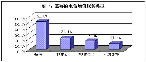 當用戶被問到“最需要的電信增值服務是什么?”,在短信、IP電話、視頻會議和網絡游戲這四個備選項當中,超過一半的被訪者選擇短信;其次是IP電話,選擇此項的被訪者占據21%;再是視頻會議,選擇此類多媒體通訊方式的被訪者約占16%;最后是網絡游戲,需要此類增值服務的人約為10%。(見圖一)