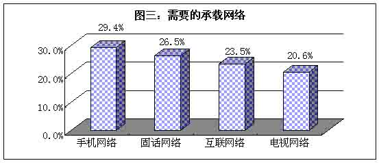 首先,手機構成移動的網絡已經超過傳統的龐大的固話網絡,成為用戶目前用戶最需要的承載網絡。這顯然是用戶市場對移動通訊方式的需求日漸強烈的表現。其次,電視網絡拉后于固話和互聯網絡,排在最后一位,這反映了未來網絡向雙向溝通發(fā)展的態(tài)勢。最后,互聯網絡雖然早于移動網絡的發(fā)展,而用戶卻更為看重后者,原因是作為互聯網絡終端設備的電腦,還不能走入普通百姓家庭,因此終端設備成為互聯網絡發(fā)展的門檻。