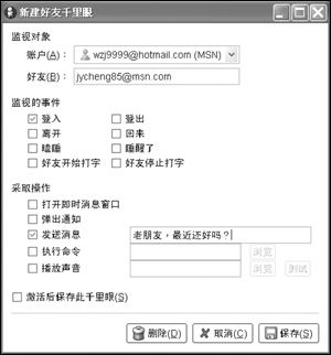 MSN可以在好友登錄時設置提示,但卻無法像QQ一樣自動發(fā)出特定問候,這未免有些遺憾。在Gaim中,我們可以為那些暫時不在線的好友添加千里眼監(jiān)視功能(如圖3),這里可以監(jiān)視的事件包括登入、登出、離開、回來、瞌睡、睡醒了、好友開始打字、好友停止打字等等,而可以設置的提示方式是打開即時消息窗口、彈出通知、發(fā)送消息、執(zhí)行命令、播放聲音等等,非常豐富!
