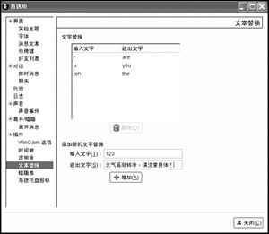 文本替換:根據(jù)用戶自定義的規(guī)則替換發(fā)出的消息,其實差不多類似于縮寫功能,你可以把一段話定義成一個字母,以后只要輸入這個字母,就會直接顯示這段話了。比如在缺省設置下,輸入“r”即可送出“are”,輸入“u”即可送出“you”(如圖7)。