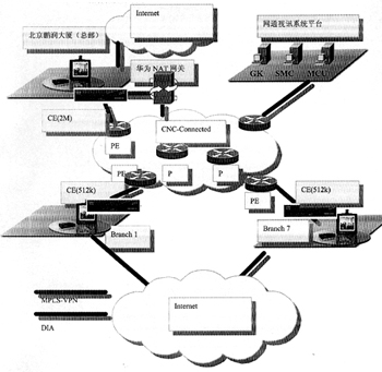鑒于客戶是通信公司,有較強(qiáng)的系統(tǒng)管理能力,而且要求視訊和數(shù)據(jù)出口分開,視訊出口在北京,可以和VPN線路走相同的物理鏈路,不會造成路由設(shè)計上的問題,故將NAT放在客戶公司總部,由用戶自己管理,增加DIA出口和費(fèi)用。網(wǎng)絡(luò)通信拓?fù)鋱D如右所示。