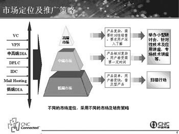 為了打開網(wǎng)通視訊業(yè)務(wù)的局面,網(wǎng)通的推廣方案也非常完備,這位負責人向記者出示了一張圖(見左下圖),詳細地解釋了網(wǎng)通視訊業(yè)務(wù)的市場定位及推廣策略。首先是通過媒體宣傳給客戶以整體印象,力求覆蓋面廣,眾所周知; 接著以直郵形式有針對性地發(fā)放詳細單頁資料,深入宣傳;然后以小型研討會、技術(shù)講座等形式,有針對性地召集當?shù)啬繕丝蛻?潛在用戶,細論VC市場及產(chǎn)品; 最后是以巡展、樣板客戶案例造聲勢,提高產(chǎn)品形象。