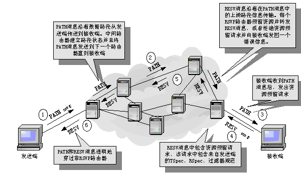 Int-Serv/RSVP服務模型在IETF RFC1633中進行了定義。RFC1633將資源預留協(xié)議RSVP作為IntServ結構中的主要信令協(xié)議。其基本思想就在于以資源預留的方式來實現(xiàn)QoS保障,RSVP是其核心部分。RSVP是主機用來從應用程序獲得特定的QoS的一種控制協(xié)議,完成綜合服務需要定義的呼叫接納控制功能和資源預留功能。端點應用程序利用RSVP消息向網(wǎng)絡提出完成數(shù)據(jù)傳送必須保留的網(wǎng)絡資源(如帶寬及緩沖區(qū)大小等),同時也確定沿傳送路徑的各個節(jié)點傳輸處理策略,從而對每個業(yè)務流實現(xiàn)逐個控制。