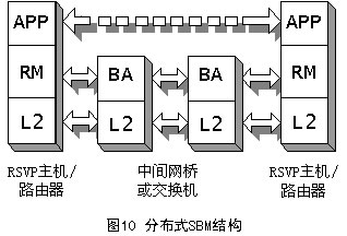SBM有兩種形式的體系結構:集中式結構和分布式結構,它取決于BA所處的位置,如圖9和圖10所示。不管在哪種形式的結構中,RM都必須在需要請求資源的端系統(tǒng)中。APP表示需要使用RM的應用,它可以是用戶應用程序,也可以是高層協(xié)議(如RSVP)。