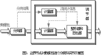 為了使用戶數(shù)據(jù)流符合SLA和TCA,邊界節(jié)點要對其進行分類和調節(jié),因而從功能上可以分為兩個模塊:分類器(classifier)和調節(jié)器(conditioner),如圖5所示。