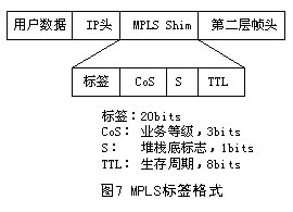 標簽的格式取決于分組封裝所在的介質。例如,ATM封裝的分組(信元)采用VPI和/或VCI數(shù)值作為標簽,而幀中繼PDU采用DLCI作為標簽。對于那些沒有內在標簽結構的介質封裝,則采用一個特殊的數(shù)值填充。圖7給出4字節(jié)填充標簽的格式,它包含一個20bits的標簽值、一個3bits的CoS值、一個1bit的堆棧標識符和一個8bits的TTL值。此外.如果填充值被插入到一個PPP或以太網(wǎng)幀中,包含在各幀頭中的一個協(xié)議ID(或以太網(wǎng)類型)表示一個幀或者一個