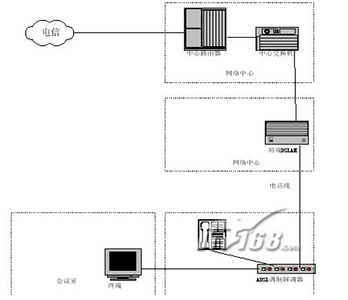 通過(guò)V.35接口接入到用戶(hù)網(wǎng)絡(luò)中的路由器上,電信網(wǎng)絡(luò)中心的MODEM則通過(guò)V.35接口接入到電信網(wǎng)絡(luò)的路由器上,連接速率從64Kbps-2Mbps可選,可以滿(mǎn)足視頻會(huì)議的接入要求。