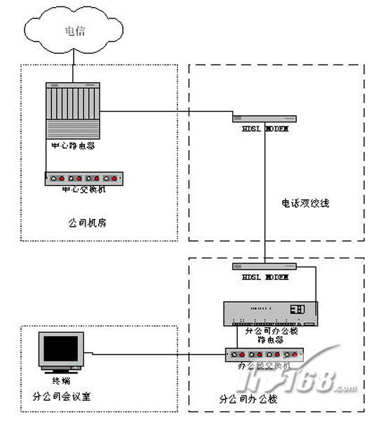 MODEM,就可以實(shí)現(xiàn)用戶(hù)到電信骨干網(wǎng)的網(wǎng)絡(luò)接入。網(wǎng)絡(luò)中心機(jī)房的HDSL MODEM通過(guò)V.35線(xiàn)纜直接接入到網(wǎng)絡(luò)中心的路由器上,用戶(hù)的HDSL