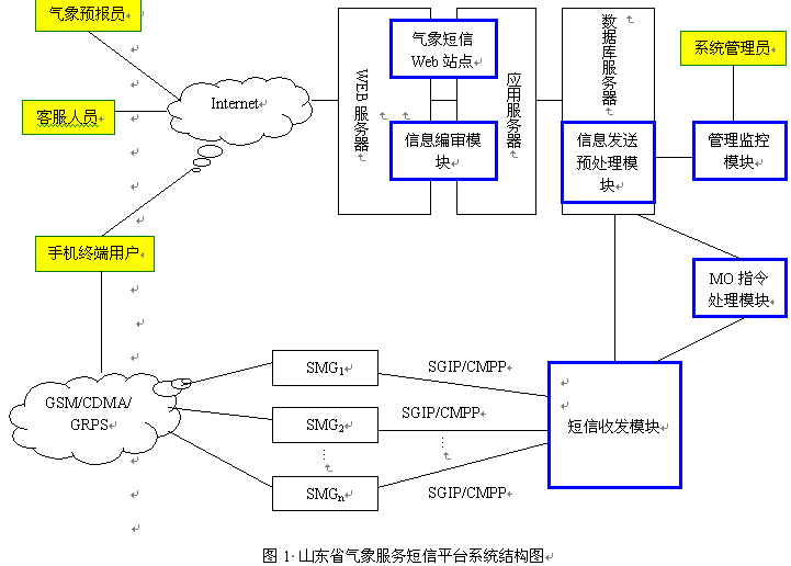 山東省氣象臺(tái)為實(shí)現(xiàn)“1210手機(jī)氣象站”服務(wù),通過技術(shù)合作的方式建設(shè)了山東省氣象服務(wù)短信平臺(tái)。該平臺(tái)采用操作系統(tǒng)無關(guān)、開放性好的J2EE軟件架構(gòu),數(shù)據(jù)庫選用處理能力強(qiáng)、穩(wěn)定性好的Oracle9i大型數(shù)據(jù)庫系統(tǒng),該平臺(tái)目前正在為全省50萬用戶每天通過短消息提供各種天氣預(yù)報(bào)服務(wù)。下面將主要介紹氣象短信平臺(tái)的系統(tǒng)結(jié)構(gòu)、各模塊功能和系統(tǒng)特點(diǎn)。