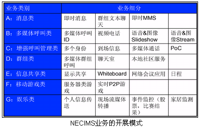 IMS業(yè)務(wù)系統(tǒng)不是單一的業(yè)務(wù)運(yùn)用平臺,而是運(yùn)營商未來業(yè)務(wù)綜合支撐和推廣的網(wǎng)絡(luò)單元,所以在IMS系統(tǒng)中,稱呼不同的業(yè)務(wù)群組或業(yè)務(wù)分組更恰當(dāng)一些。NEC按照這個模式,將IMS業(yè)務(wù)應(yīng)用分為下列類型: