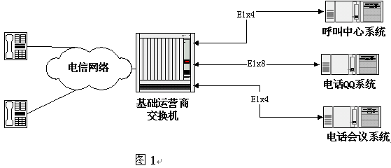 一種方式為固定分配, 即為每種語音系統(tǒng)分配固定數(shù)量的E1中繼,如圖1所示,這種方式的問題主要有兩個(gè)方面:一是中繼資源沒有充分共享使用,比如在晚上,可能電話QQ業(yè)務(wù)量很大而呼叫中心很小,而白天卻正好相反。如果為每一種業(yè)務(wù)都留有很大的中繼富裕又勢(shì)必導(dǎo)致中繼資源的浪費(fèi);二是當(dāng)中繼線路來源于多個(gè)運(yùn)營商時(shí)存在連接上的困難。
