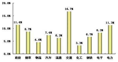 2005年中國(guó)主要行業(yè)的大型用戶(hù)呼叫中心需求比例平均為8.5%。其中需求比例較高的行業(yè)有交通、政府、電力,這些行業(yè)大型用戶(hù)呼叫中心需求比例超過(guò)了10%。另外,煙草、汽車(chē)制造、流通和鋼鐵企業(yè)呼叫中心需求大致在7%~8%左右。物流行業(yè)和化工企業(yè)需求比例較低。
