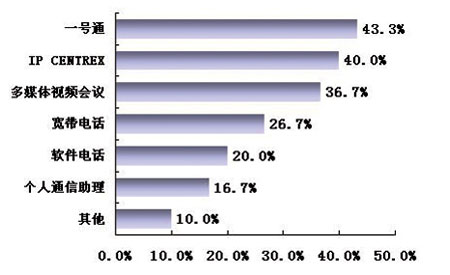 CENTREX感興趣的用戶(hù)為40.0%,對(duì)多媒體視頻會(huì)議感興趣的用戶(hù)達(dá)到36.7%,對(duì)寬帶電話(huà)感興趣的用戶(hù)達(dá)到26.7%。