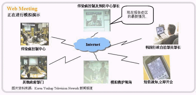 在韓國已經(jīng)安排多次的模擬演示,當疫情在韓國發(fā)生及蔓延時,由韓國傳染病控制及預(yù)防中心發(fā)出開會通知,召集其他緊急醫(yī)療機構(gòu)、專家及政府部門(如行政自治部)等,一起進行視像會議。在會議上,傳染病控制中心將各地收集回來的最新情況及報表共享給參會人及團體。由各專家一起分析現(xiàn)況,進行討論、判斷及決定解決辦法及措施。同時要求其他政府部門協(xié)調(diào)與全力幫助,目的是將疫情在最短的時間及在最少的范圍內(nèi)得到控制及處理,減少對人民生命安全及國家損失的影響。先進的通訊科技能加快對危機發(fā)生時,政府相關(guān)部門及機構(gòu)對事件的了解、分析、處理及決策,準確傳達信息、加強信息的交流、提高辦事效率、加快決策速度以及落實措施及處理方法的執(zhí)行。最重要的事,將各方面的損失降到最低的程度,避免了事情的惡化及波及其他范圍的負面影響。