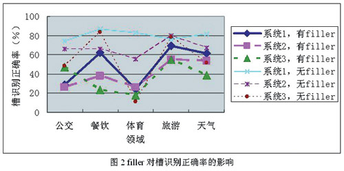 對于電話連續(xù)語音識別來說,由于錄制環(huán)境是辦公室真實環(huán)境,因此噪音并不是影響性能的主要因素。電話連續(xù)語音識別分為5個子領域,每個子領域各有一套語法。評測句子由語法生成的有效成分在前后加上任意長的填充詞(filler)構(gòu)成,如語法生成的句子為“從天安門到中關(guān)村怎么坐公交車”,而實際錄制的句子是“你好,請問從天安門到中關(guān)村怎么坐公交車,可以查到嗎?”,其中的“你好,請問”和“可以查到嗎”就是filler。由分析可以發(fā)現(xiàn),不同領域內(nèi)的槽識別正確率相差很大。這主要有兩個原因,一是不同領域的語法復雜度不同,二是不同領域內(nèi)有filler的句子所占比例不同。為了進一步衡量filler對識別的影響,選取三個識別系統(tǒng),將有filler的句子和沒有filler的句子分別計算識別率,統(tǒng)計結(jié)果如圖2所示。從圖中可以看出,filler對識別的影響是相當大的,無filler的句子比有filler的句子識別正確率可以高幾十個百分點。