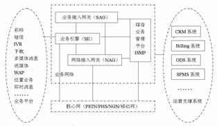在電信集團的統(tǒng)一規(guī)劃下,ISMP和SAG相繼推出。ISMP是綜合增值業(yè)務(wù)管理平臺,ISMP不但可以解決現(xiàn)網(wǎng)固網(wǎng)/PHS業(yè)務(wù)管理的問題,而且可以配合促進3G業(yè)務(wù)試驗和體驗,不斷完善,進行增值業(yè)務(wù)價值鏈、業(yè)務(wù)內(nèi)容合作,收集市場需求和完善的增值業(yè)務(wù)應(yīng)用模式,整合和強化現(xiàn)有的市場營銷環(huán)節(jié)。SAG是業(yè)務(wù)接入網(wǎng)關(guān),它包含與業(yè)務(wù)引擎的“業(yè)務(wù)能力驅(qū)動”接口,包含與ISMP的“SP/用戶管理”接口,包含對移動和固定網(wǎng)絡(luò)的支持。ISMP、SAG與業(yè)務(wù)平臺和周邊支撐系統(tǒng)的關(guān)系如圖7所示。