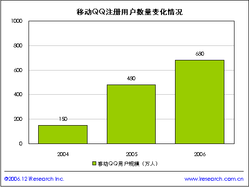 近兩年移動QQ的市場規(guī)模迅速擴(kuò)大,iResearch研究結(jié)果顯示2006年移動QQ用戶規(guī)模達(dá)到680萬人,移動QQ所帶來的現(xiàn)金收入成為騰訊上市公司最重要的收入之一。移動IM與互聯(lián)網(wǎng)IM最大的不同在于產(chǎn)業(yè)鏈移動運營商的參與。艾瑞認(rèn)為互聯(lián)互通是移動IM產(chǎn)業(yè)整合和發(fā)展必然趨勢。