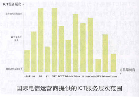 ICT服務(wù)的范圍大致可分為三個層次,一是面向網(wǎng)絡(luò)通信設(shè)施(包括網(wǎng)絡(luò)規(guī)劃、網(wǎng)絡(luò)系統(tǒng)集成、外包管理等)的服務(wù),二是面向IT應(yīng)用系統(tǒng)(包括軟件系統(tǒng)支持與維護(hù)、系統(tǒng)集成、應(yīng)用托管等)的服務(wù),三是面向業(yè)務(wù)流程系統(tǒng)(包括系統(tǒng)咨詢、業(yè)務(wù)流程外包等)的服務(wù)。從客戶視角來看,第三種服務(wù)的層次最高,第一種服務(wù)的層次最低,而電信運(yùn)營商提供的ICT服務(wù)層次越高,則表明其在該領(lǐng)域拓展的范圍越廣。上述國際電信運(yùn)營商提供的ICT服務(wù)層次范圍如下圖所示。
