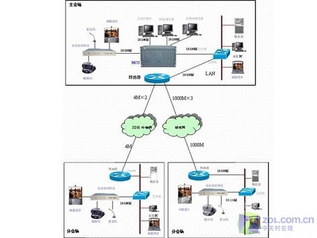 上面是一個基于H.323協(xié)議的典型視頻會議系統(tǒng)組網方案。由于基于H.323的視頻會議系統(tǒng)在物理線路上是允許與數(shù)據網絡共用的,所以上面的組網方案中還包括了數(shù)據網絡的部分。