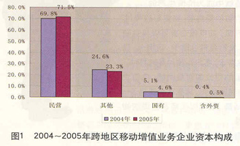 電信增值市場(chǎng)的開放和政策環(huán)境的優(yōu)化,也吸引了眾多的外資企業(yè)。電信增值服務(wù)的投資來源、經(jīng)營主體、服務(wù)目標(biāo)、經(jīng)濟(jì)功能與基礎(chǔ)電信業(yè)務(wù)存在明顯差異,彼此間有競(jìng)爭(zhēng)關(guān)系,但更多的是補(bǔ)充、豐富的關(guān)系。目前,我國已放開電信增值市場(chǎng)準(zhǔn)入,從2005年起,整個(gè)電信增值業(yè)務(wù)市場(chǎng)就呈現(xiàn)出持續(xù)快速發(fā)展的勢(shì)頭,民營資本已經(jīng)發(fā)展成為電信增值業(yè)務(wù)領(lǐng)域的主力軍,其所占企業(yè)數(shù)量比例已超過70%(見圖1)。