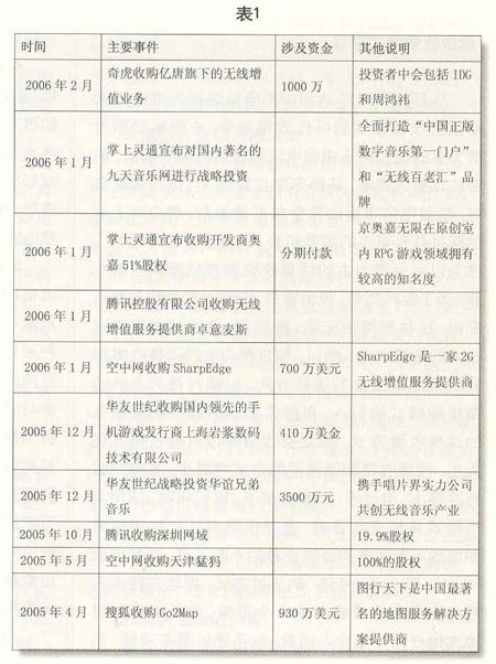 從2003年開始,國內(nèi)就顯現(xiàn)出并購增值服務(wù)運(yùn)營企業(yè)的苗頭。2004年以來,隨著整治增值服務(wù)運(yùn)營企業(yè)的力度不斷加大,并購漸成風(fēng)潮(見表1)。2004年2月,新浪收購深圳網(wǎng)興科技公司;2004年5月,搜狐收購手機(jī)WAP服務(wù)提供商北京吉菲爾公司。2005年,在“超級(jí)女生”節(jié)目大獲成功后,掌上靈通宣布將對(duì)國內(nèi)著名的九天音樂網(wǎng)進(jìn)行戰(zhàn)略投資,全面打造“中國正版數(shù)字音樂第一門戶”和“無線百老匯”品牌。各大移動(dòng)增值業(yè)務(wù)服務(wù)商通過并購競(jìng)爭(zhēng)對(duì)手,門戶網(wǎng)站可以在移動(dòng)增值服務(wù)領(lǐng)域?qū)で笮碌耐黄疲@得可觀的利益,增強(qiáng)自身的競(jìng)爭(zhēng)力。伴隨著3G商用的日益臨近和市場(chǎng)競(jìng)爭(zhēng)的不斷加劇,主流SP(服務(wù)提供商)進(jìn)一步加快了資本購并和業(yè)務(wù)整合的步伐,整個(gè)SP行業(yè)將加速洗牌。經(jīng)過市場(chǎng)整合,主流SP將不斷做大做強(qiáng),而相當(dāng)多的缺乏市場(chǎng)競(jìng)爭(zhēng)力的SP將被淘汰出局。