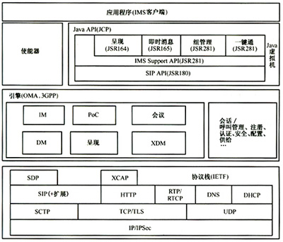 通過對于IMS客戶端相關(guān)規(guī)范的研究與分析,可以看出IETF提供了IMS客戶端所需要的協(xié)議部分,包括詳細的SIP信令消息交互,服務(wù)參數(shù)協(xié)商、媒體流的建立、XML文檔的交互等。3GPP和OMA提供了IMS客戶端所需要的服務(wù)引擎,與不同應(yīng)用服務(wù)器之間的交互方式以及如何接入到IMS網(wǎng)絡(luò)等。JCP提供了一整套IMS客戶端上Java應(yīng)用程序所需的標(biāo)準(zhǔn)Java應(yīng)用編程接口。由此可以總結(jié)歸納出IMS客戶端軟件架構(gòu)參考,具體參見圖2。