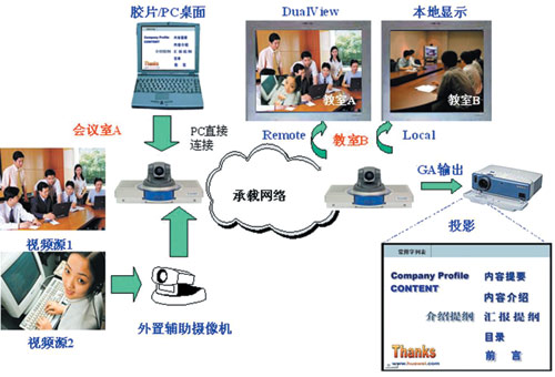 會議中常常需要同時傳送演講人的演講膠片和演講人的圖像,這套視訊系統(tǒng)非常方便地支持此功能,只需要把演講人的便攜機用線纜接到會場的終端上,通過終端的SXGA輸入功能可方便地將膠片信息發(fā)送到遠端會場,遠端會場通過終端的SXGA輸出接口將膠片內(nèi)容通過投影設備顯示出來,而終端的主視頻輸出接口顯示的是遠端演講人的圖像。