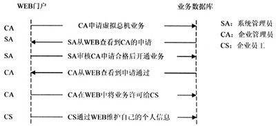 虛擬總機(jī)系統(tǒng)開(kāi)戶流程采用WEB方式實(shí)現(xiàn),以此完成用戶對(duì)虛擬總機(jī)業(yè)務(wù)的定購(gòu)、系統(tǒng)管理員對(duì)用戶開(kāi)戶申請(qǐng)的審核、用戶業(yè)務(wù)參數(shù)的控制等操作,最后企業(yè)員工可以在企業(yè)管理員許可業(yè)務(wù)后,登陸WEB門戶管理個(gè)人信息。具體流程如圖2所示。