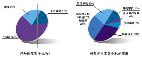 根據(jù)調(diào)查結(jié)果,目前國(guó)內(nèi)知道黑莓手機(jī)的消費(fèi)者僅占20%,有63%的消費(fèi)者從沒有聽說過“黑莓”這個(gè)名字,還有17%的消費(fèi)者只是有點(diǎn)印象。