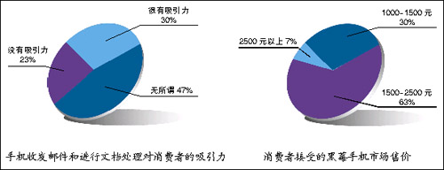 另一個(gè)調(diào)查項(xiàng)目展現(xiàn)了這個(gè)問題的另一面。調(diào)查顯示,只有28%的消費(fèi)者知道黑莓手機(jī)的核心功能是郵件的Push功能和在線文件處理。并且,在這些人中,83%的人認(rèn)為這個(gè)功能的收費(fèi)令他們無法接受。