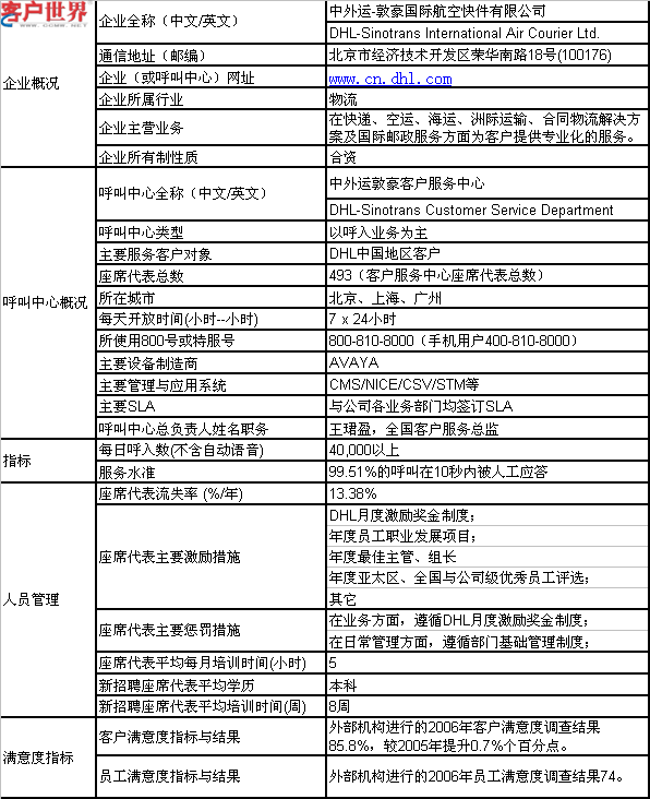 中外運敦豪客戶服務(wù)中心1997年創(chuàng)立,一直以來都在以提升客戶滿意度為目標,致力于成為世界一流的客戶服務(wù)中心,創(chuàng)造并推動服務(wù)競爭優(yōu)勢,以期為客戶創(chuàng)造更多價值。