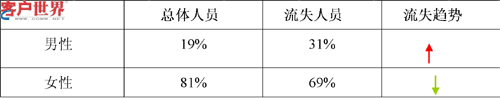 把二組數(shù)據(jù)放在一起比較后我們得出以下結(jié)論:男性座席比女性座席更容易流失,這是因為呼入型的呼叫中心對座席人員的耐性和承受能力要求較高,相對而言,男性座席對這方面的適應性較差。