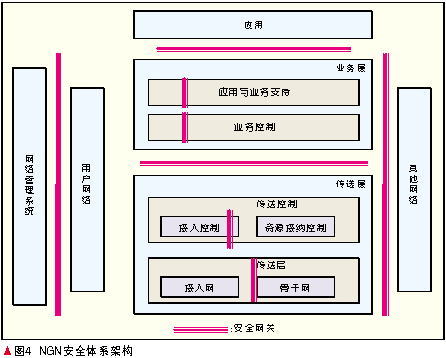 為了給網(wǎng)絡(luò)運(yùn)營商、業(yè)務(wù)提供商和用戶提供一個(gè)安全可信的網(wǎng)絡(luò)環(huán)境,防止各種攻擊,NGN需要避免出現(xiàn)非授權(quán)用戶訪問網(wǎng)絡(luò)設(shè)備上的資源、業(yè)務(wù)和用戶數(shù)據(jù)的情況,需要限制網(wǎng)絡(luò)拓?fù)浣Y(jié)構(gòu)的可見范圍,需要保證網(wǎng)絡(luò)上傳送的控制信息、管理信息和用戶信息的私密性和完整性,需要監(jiān)督網(wǎng)絡(luò)流量并對異常流量進(jìn)行管理和上報(bào)。